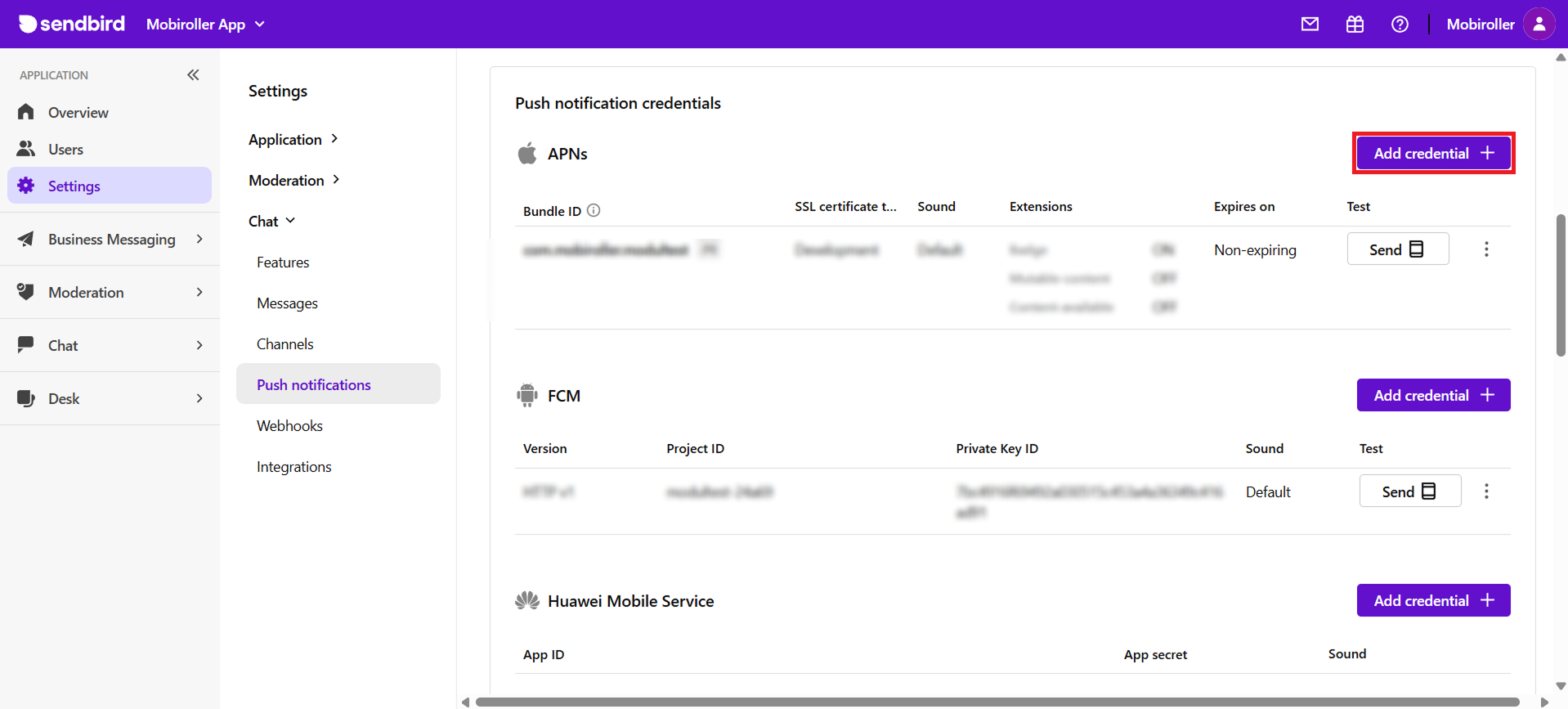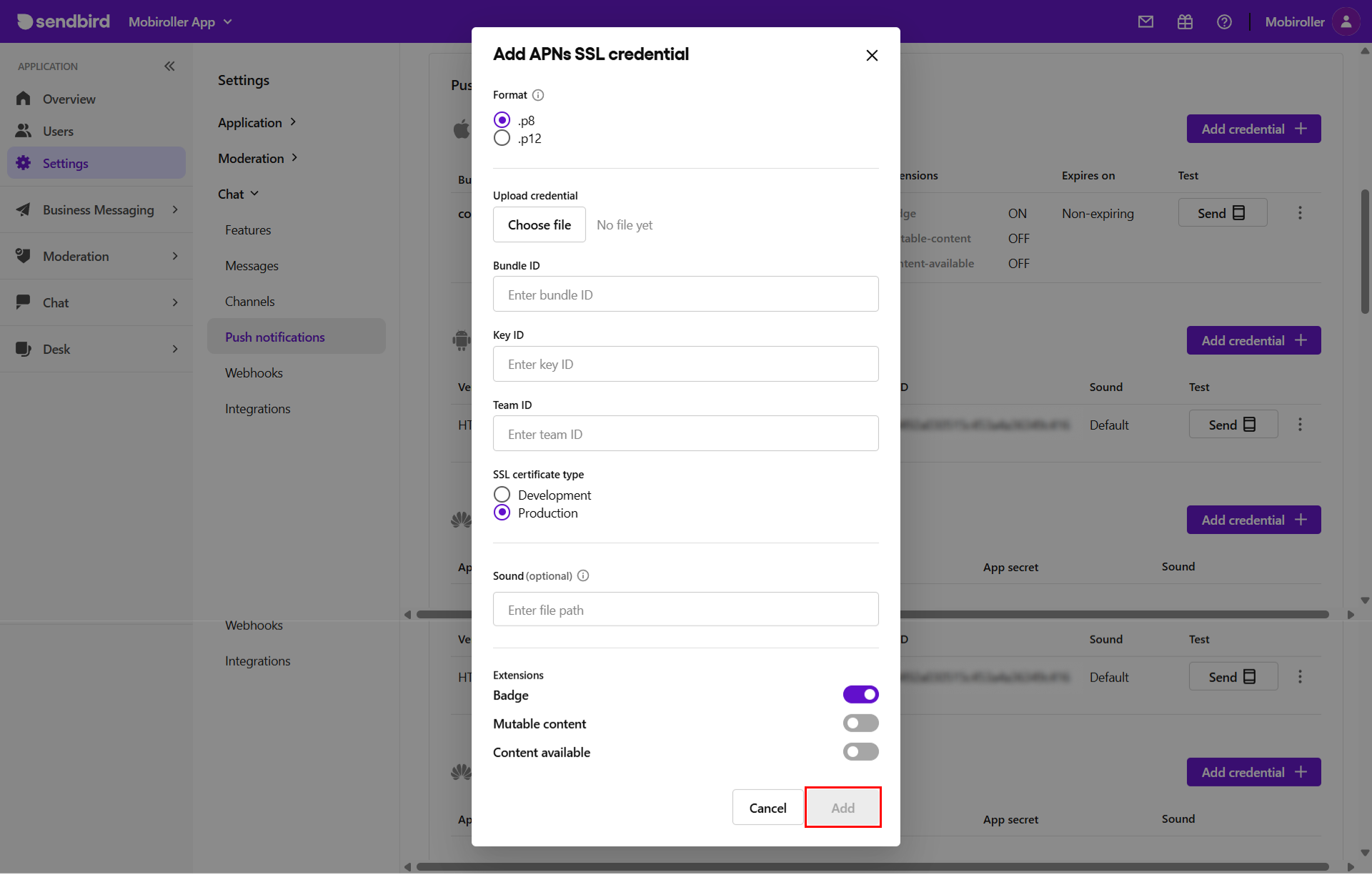 - Açılan ekranda APNs kısmında bulunan Add credential butonuna tıklayın.