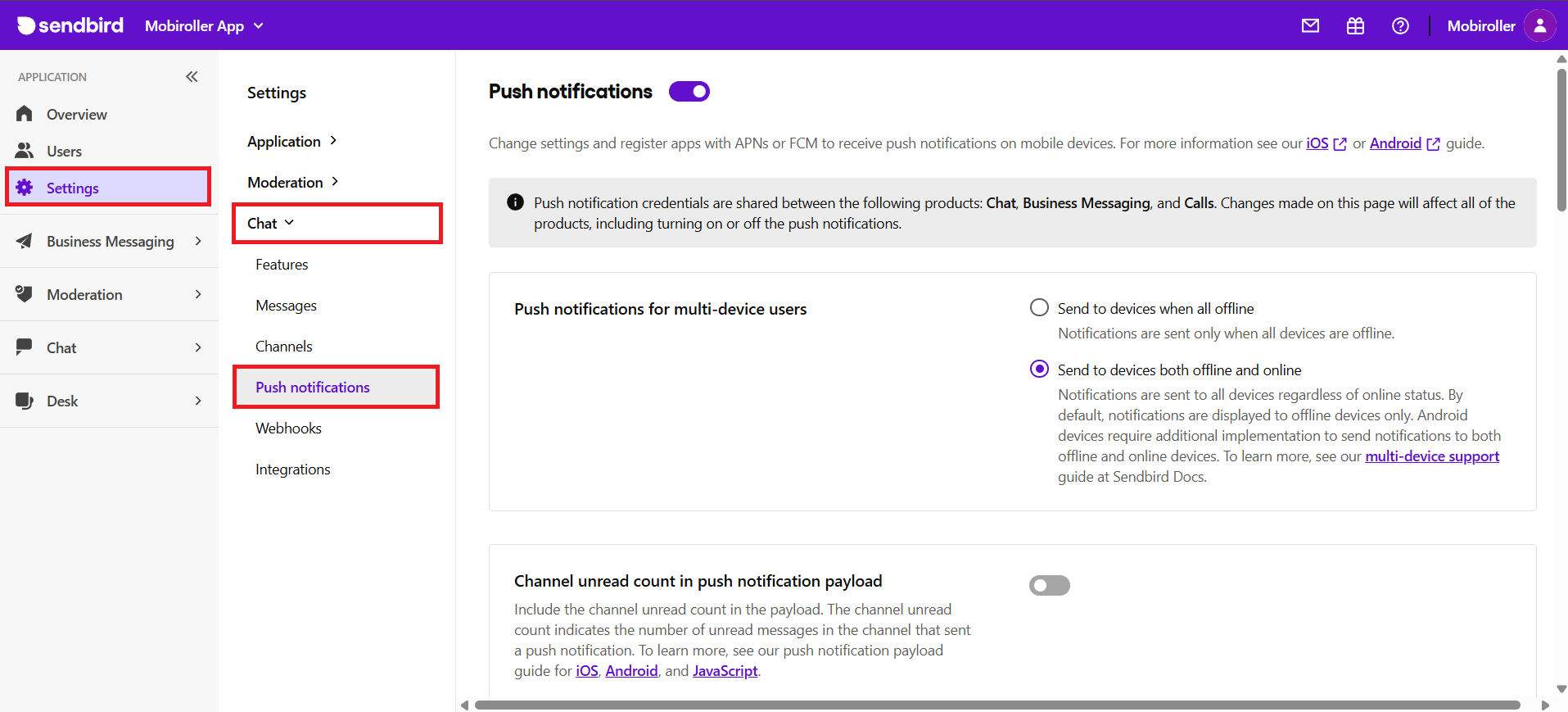 - Settings > Chat > Push notifications adımlarını izleyin.