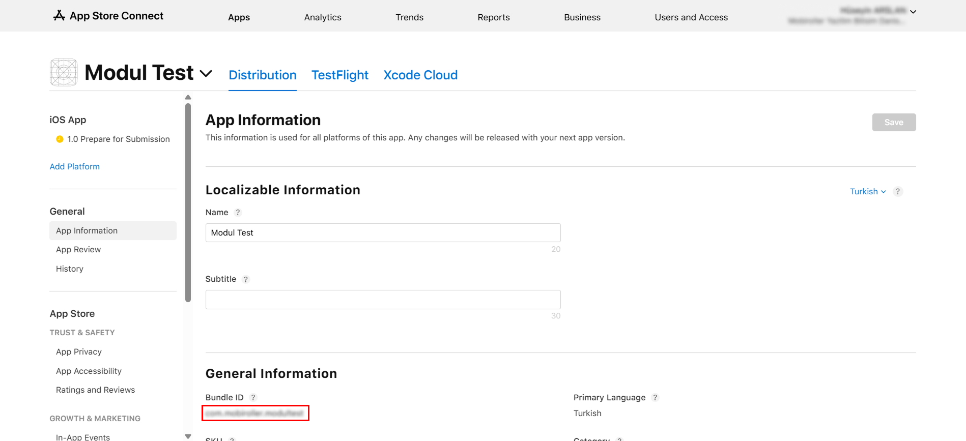 - Bundle ID alanına App Store Connect üzerinden erişeceğiniz uygulamanızın Bundle ID değerini girmeniz gerekmektedir. Bu değere App Store Connect > App Information > General Information alanından erişebilirsiniz.